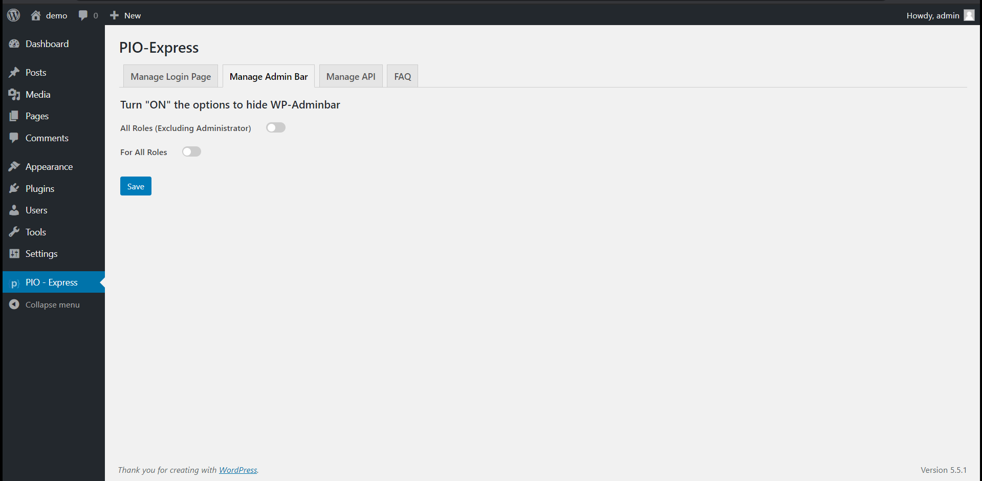 - Click on the PIO – Express from the WP Admin Menu and then select the Manage Admin Bar.