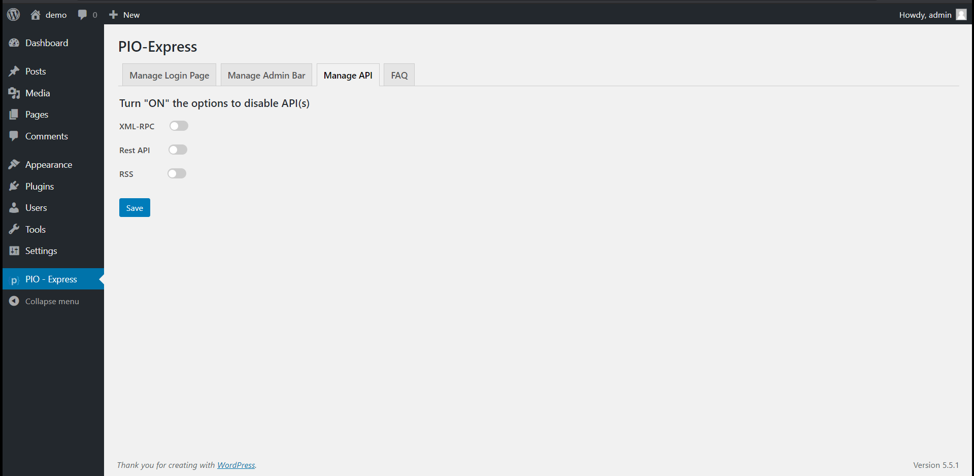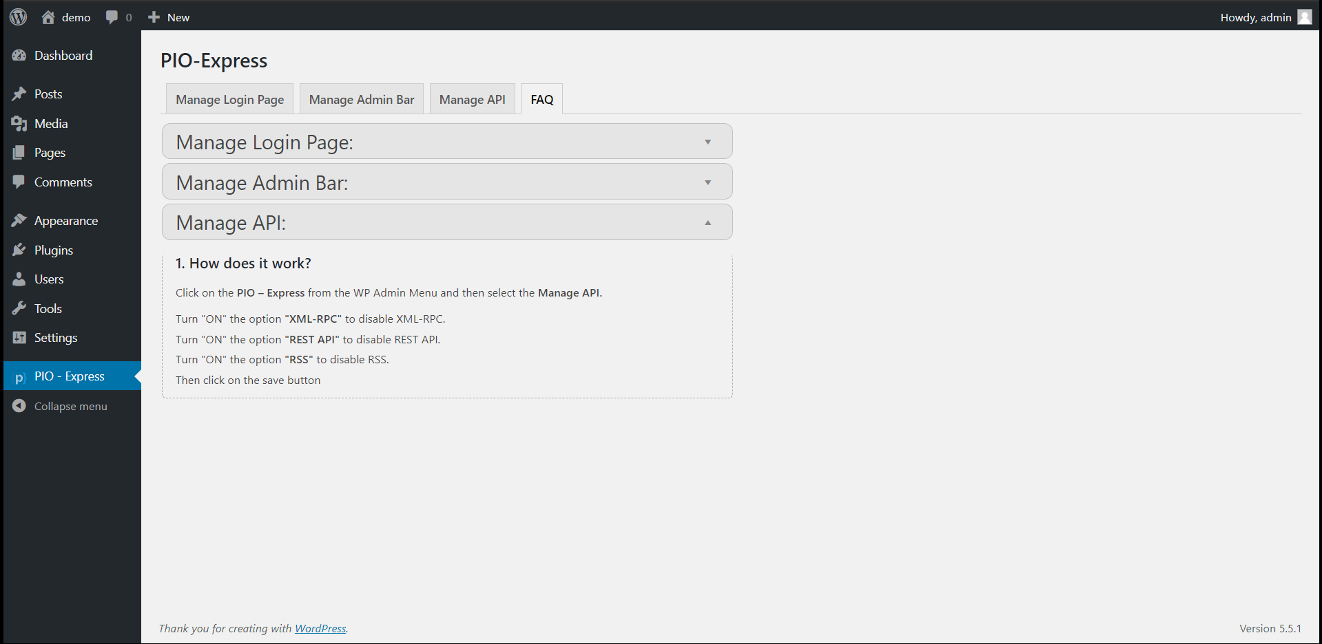 - Click on the PIO – Express from the WP Admin Menu and then select the Manage API.