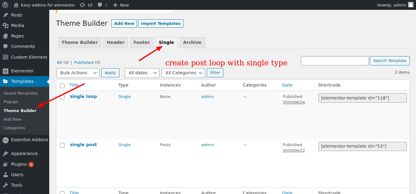 - Create a new Elementor Template and select the Single;