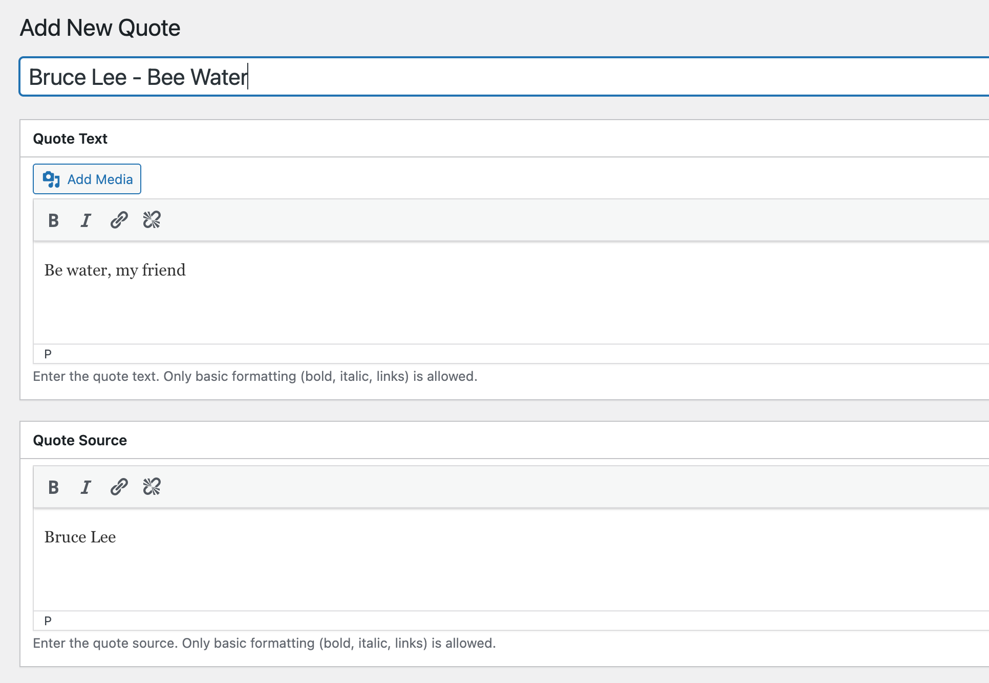 Go to Quotes > Add New in your WordPress admin. Add the quote title, content (with basic formatting), author, source, and categories just like creating a post.