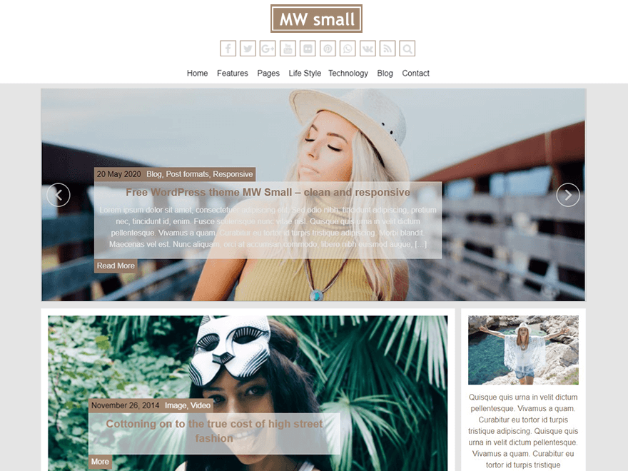 MW Small is a minimalistic responsive and customizable free blogging WordPress theme, built with Twitter Bootstrap 3.0. Support WordPress post formats: Image, Gallery, Video, Status, Quote, Audio and Link. Easily customized from the theme customizer. You can upload your own Logo, set left sidebar or right, add your Social Links, custom color schemes, FontAwesome icons, 2 header layouts, 2 featured slider layouts, translation ready and many other. Has 3 Footer Widget Areas and Footer Widget Instagram. MW Small is a perfect WordPress theme for personal, fashion, travel, business minimal blog or lifestyle blog. Demo: http://demo.mwthemes.org/mw-small/