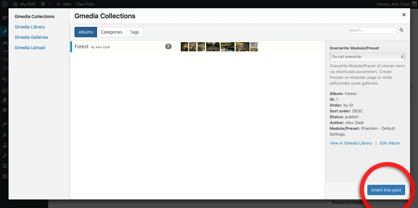Clicking on Insert into post button will close the Gmedia uploader and insert the gallery code inside your WordPress post.