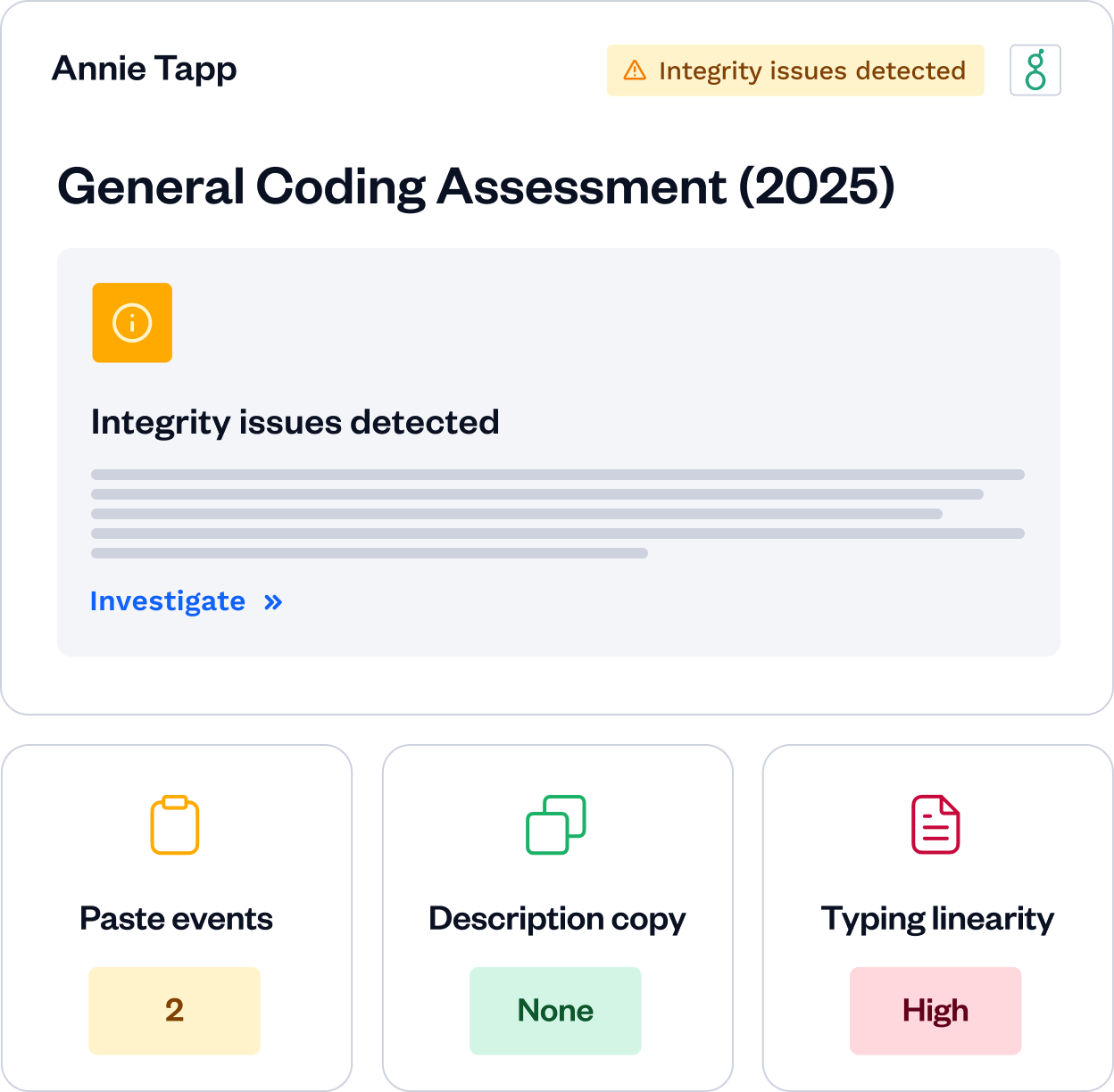 This depends on your configuration. Traditional assessments prohibit unauthorized AI use and detect AI-generated code. We also offer AI-Assisted Assessments with Cosmo, our integrated AI assistant, so you can evaluate how candidates leverage AI tools, a critical skill for modern developers.