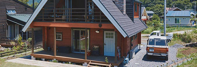 同じログハウスが並ぶ双子住宅。「となり暮らし」という不思議なコミュニティを育む