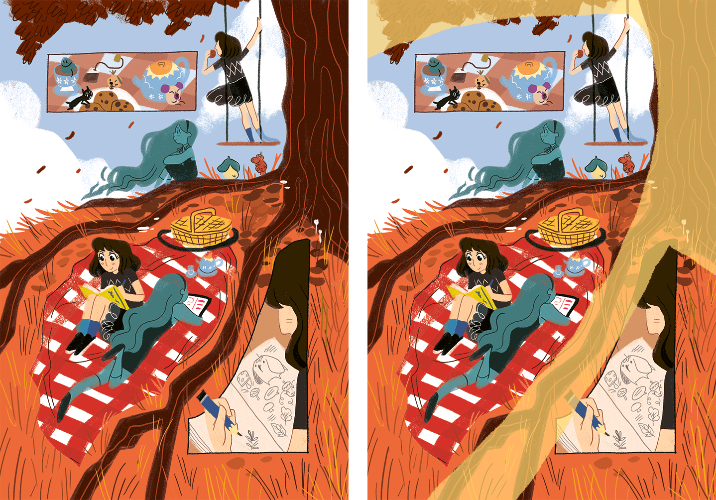 The curve between the tree’s branch and trunk guides the eye into the panels. Séance Tea Party, Reimena Yee.
