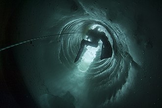 Polar scientific diver in an ice well at a French scientific base in Antarctica. Change image |