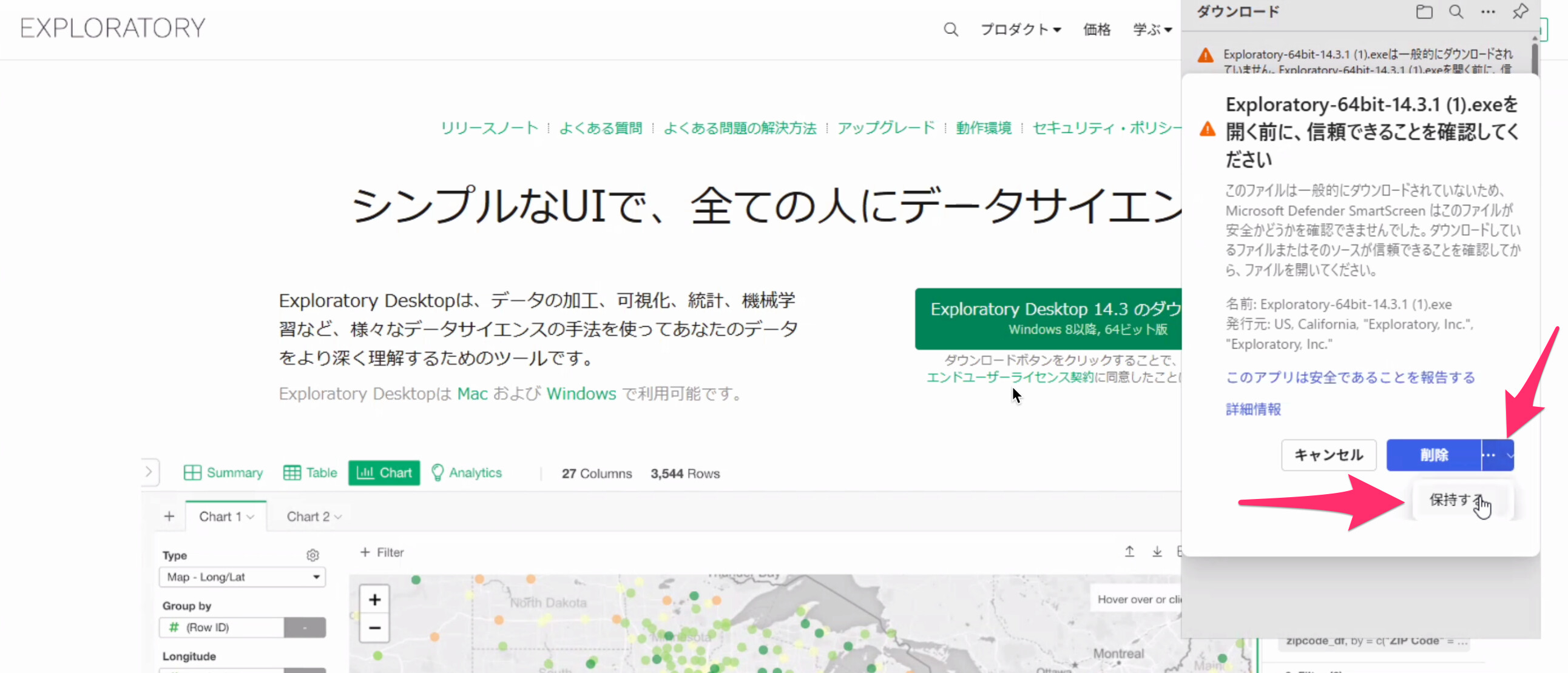 WindowsのEdgeブラウザからExploratoryデスクトップをダウンロードしようとすると以下のような警告が表示されることがあります。