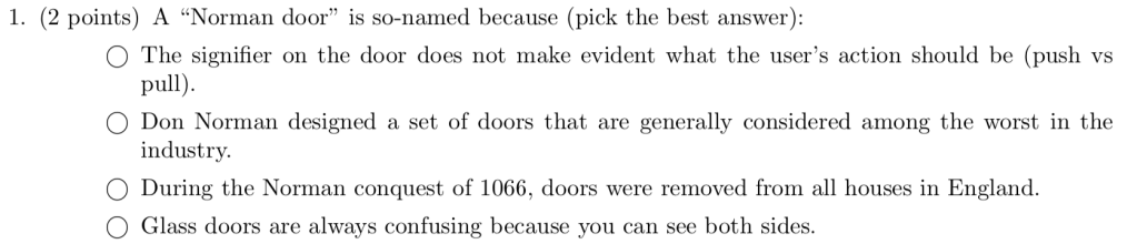 Since we watched in lecture a nice video starring Don Norman explaining “Norman doors,” I was pretty sure that anyone who actually attended lecture that day would know that the answer was the first one in the list. Still, maybe a half-dozen students chose the second item.