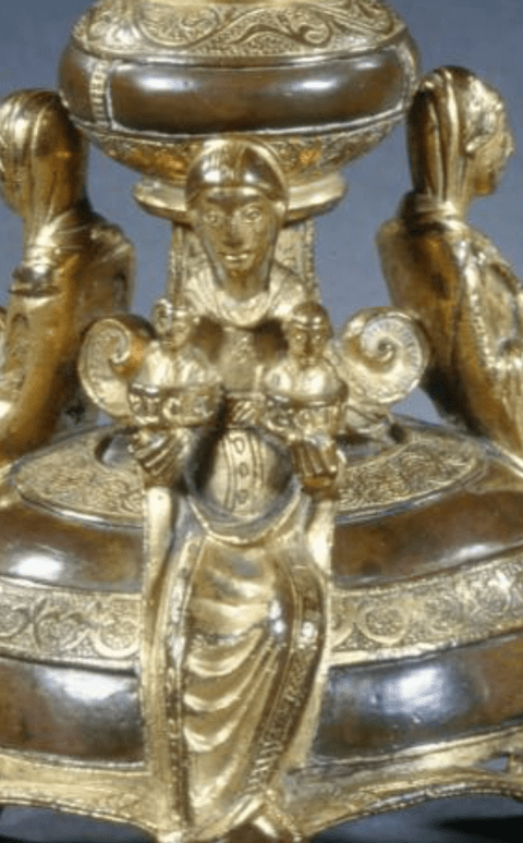 Details of the Hildesheim candlesticks with allegorical figures associating Scientia with Africa (left), and Theorica and Practica (right) with Medicina, 12th century. Source: Fotograf*in: Christian Tepper; https://www.bildindex.de/document/obj20313186, accessed 25.i.2026.