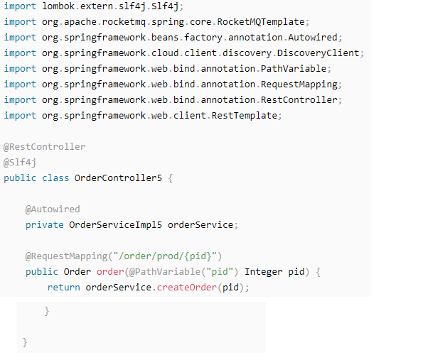 | @FeignClient(value = “service-product”) public interface ProductService { //减库存 @RequestMapping(“/product/reduceInventory”) void reduceInventory(@RequestParam(“pid”) Integer pid, @RequestParam(“num”) int num); } |