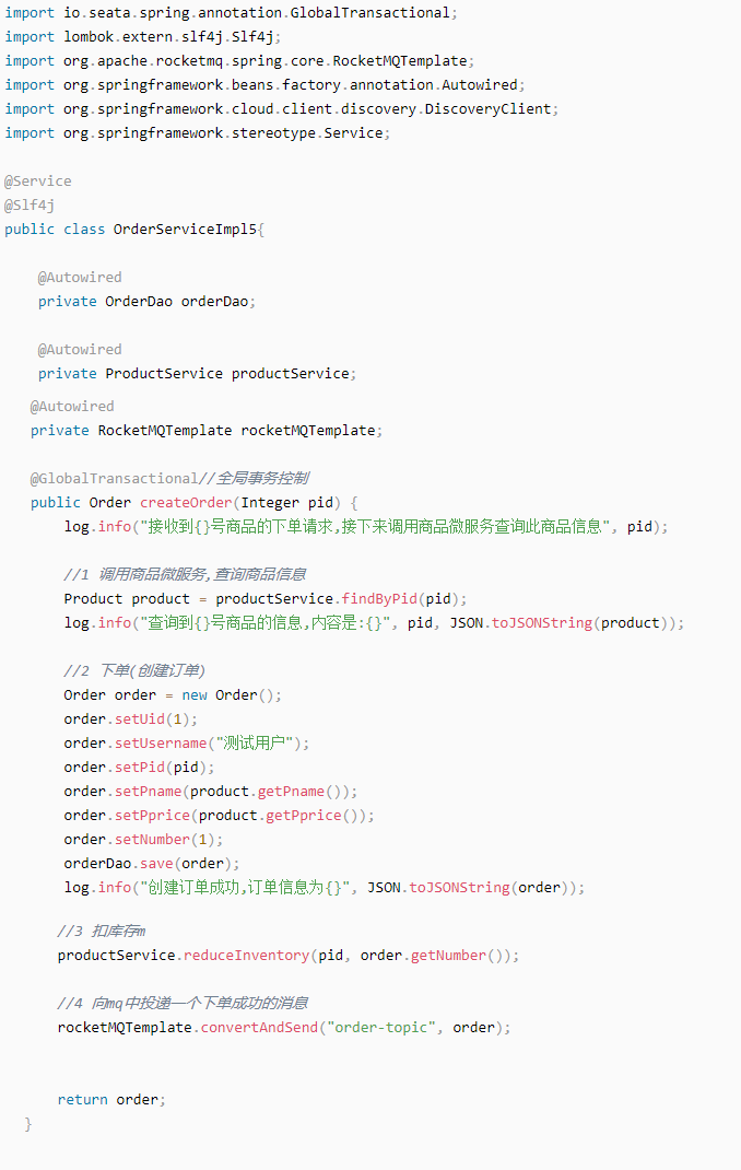 | @GlobalTransactional//全局事务控制 public Order createOrder(Integer pid) {} |