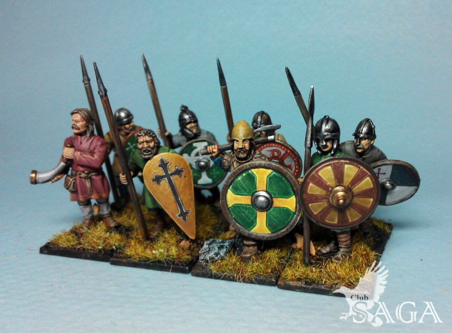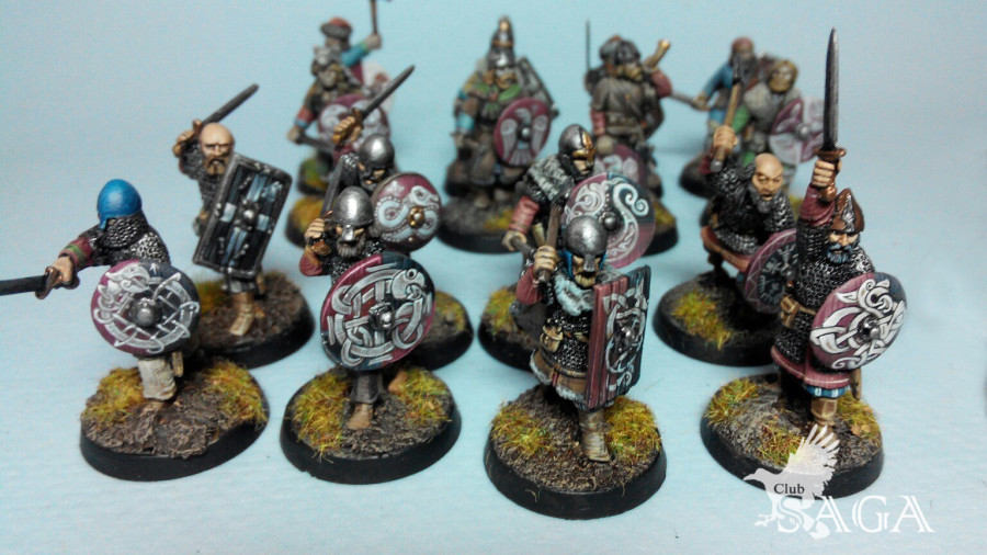 В общем 6 очков в банде. папа, дровосеки, простые парни, все как по канону. модели сами по себе убогонькие, но в процессе покраса безбожно доставляют. так как в Саге на модели главное то открасить щит ( потмоу что больше там ничего и нет, толком то)я, не долго думая, решил оттянутся на щитах, ибо без фрихендов на низ щиты смотрятся как дно океана, плоско и скучно. в итоге нарисовал всем йормунгадов и ворон дабы отличить теплое от мягкого, овец от агнцов, козлищ от плевел а воинов от дружины. потому что субординация это важно.