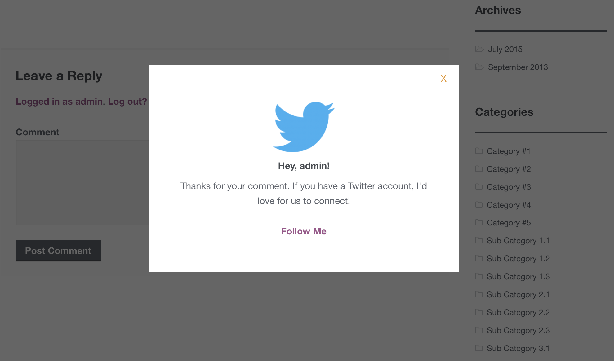 Display a modal prompt after a user successfully posts a comment. Great for calls to action like social follows, product views, etc.