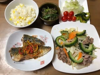 サバの南蛮漬け・炒め物(豚肉・ゴーヤ・玉ねぎ・もやし・キャベツ)