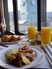 <朝食>今日も、朝食をいただくために、ラウンジへ。朝は、とても天気が良かった。ほぼ前日と同じような内容だったが、卵からパンまで、ラウンジ食にしては、種類も多く、満足。今日は、空港へ向かうだけなので、ゆっくりと朝食タイムを過ごした。