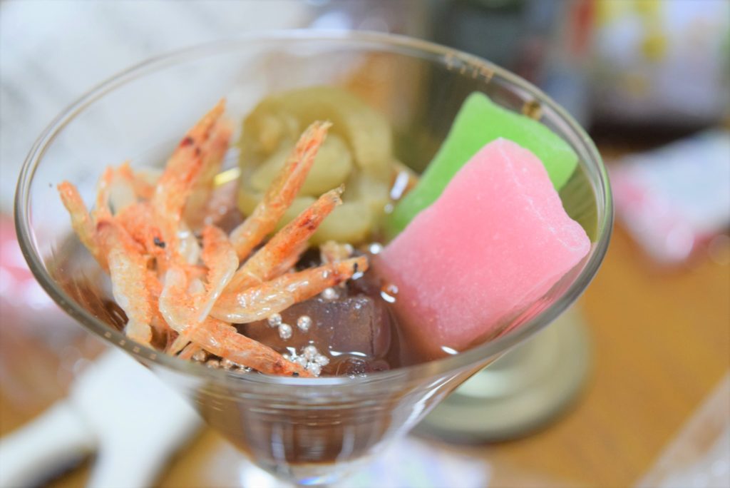 ▲桜えびがきれいに盛られています。あでやかな色調で、お正月のような浮かれ具合があるあんみつです
