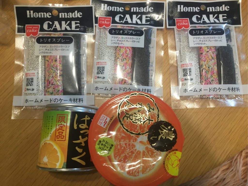 ▲自信満々で用意した、お菓子の飾りつけに使うやつ、はっさくの缶詰、みかんゼリー