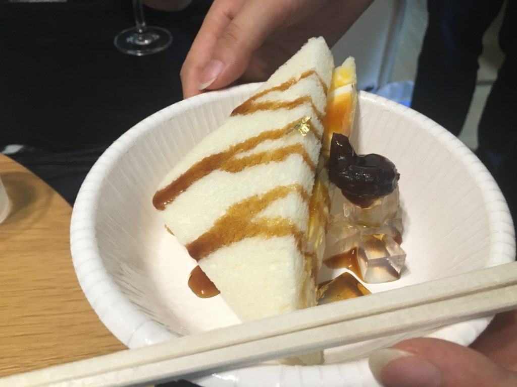 ▲あんみつのサンドイッチ添え!?斬新すぎる……。卵サンドに金箔と黒蜜がかかっています