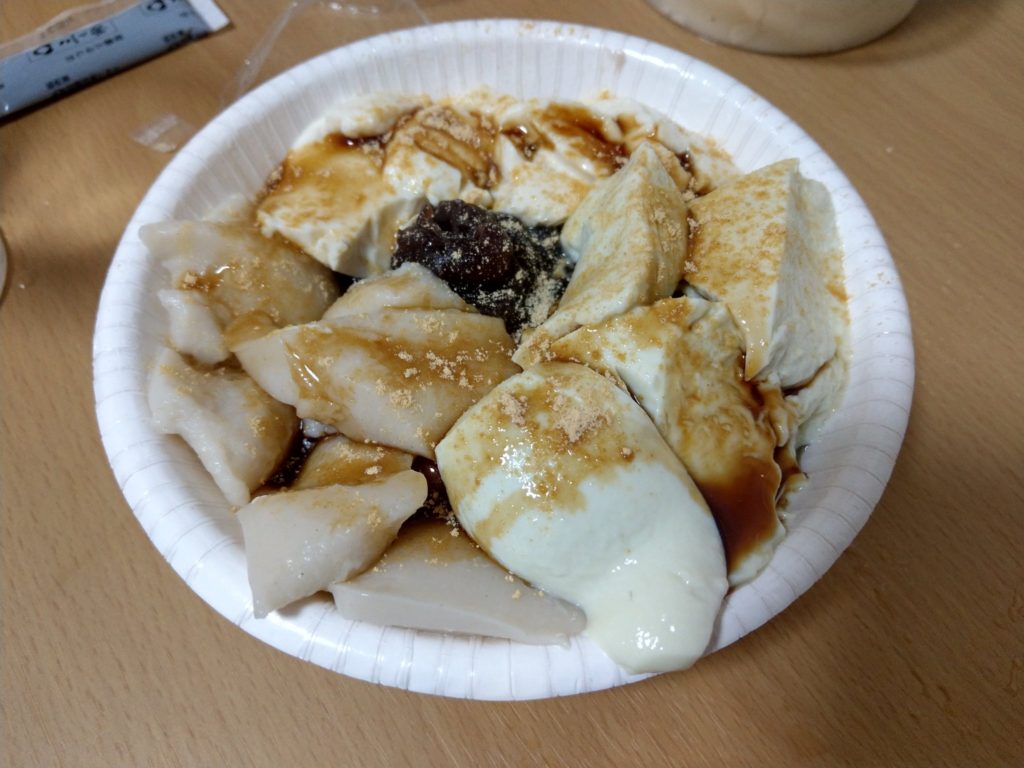 ▲豆腐、あんこ、きな粉、黒蜜などが盛られたあんみつ。ほぼ豆腐