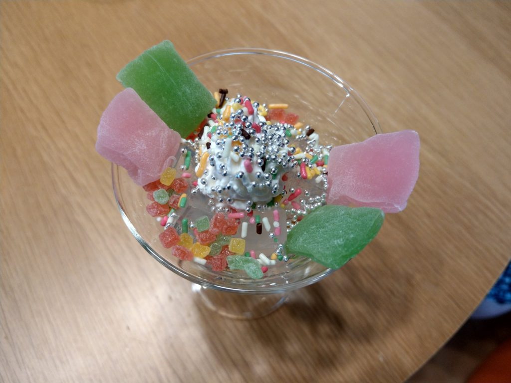 カラースプレーと求肥(ぎゅうひ)のカラフルさでゆめかわ感を出したかったのですが、伝わるでしょうか。伝わりますよね!!!