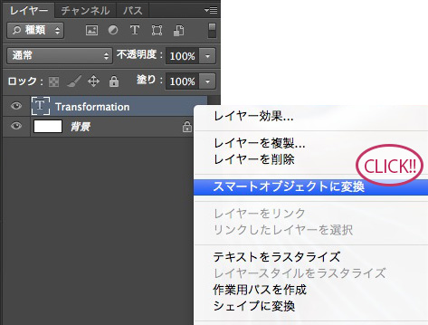 やり方は簡単、レイヤーパレットで変形したいテキストレイヤーを選択し、右クリックで「スマートオブジェクトに変換」を選ぶだけです。