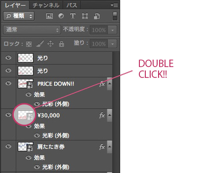 スマートオブジェクト化したテキストを変更するにはレイヤーパレットのスマートオブジェクト化したテキストレイヤーの左側のサムネイル部分をダブルクリックしてください。
