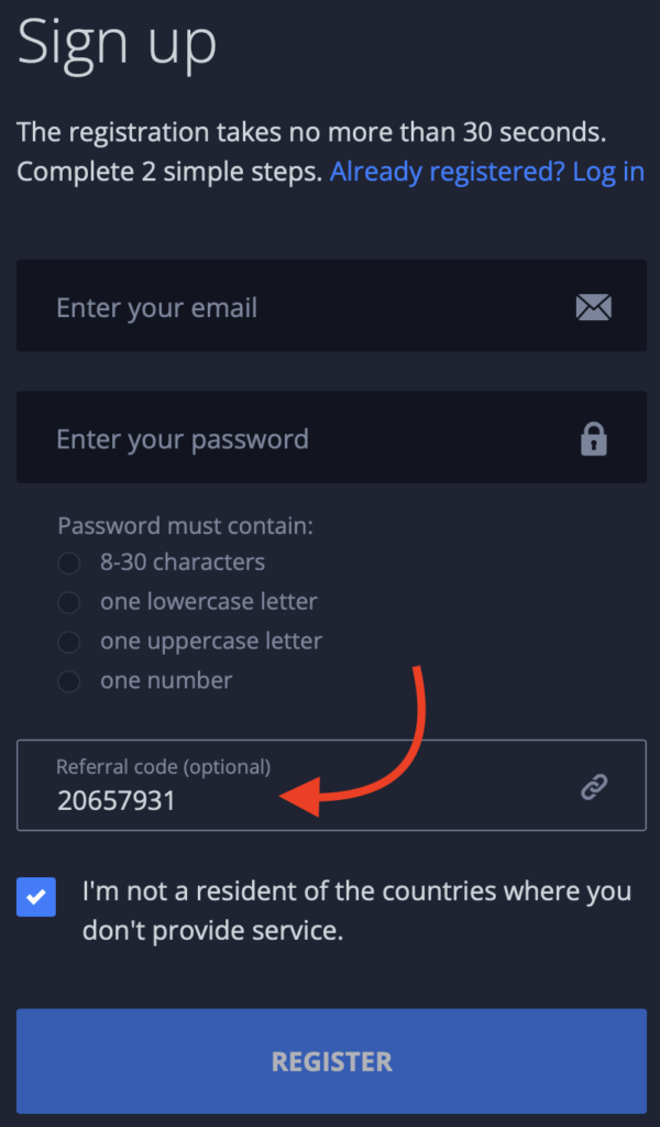- Zadejte doporučující kód 20657931 (pokud nevidíte pole s doporučujícím kódem, nezoufejte – byl již použit, protože jste použili náš doporučující odkaz).