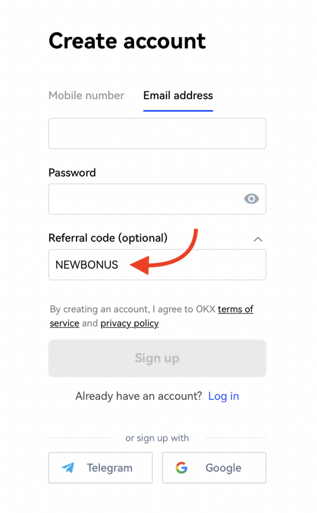 Der OKX-Anmeldebonus ist sehr einfach zu bekommen. Um den Willkommensbonus zu erhalten, müssen die Nutzer den Empfehlungscode bei der Registrierung auf der OKX-Tauschplattform verwenden. Sie können dies tun, indem sie den Promo-Code NEWBONUS zum Zeitpunkt der Kontoerstellung auf der Plattform eingeben.