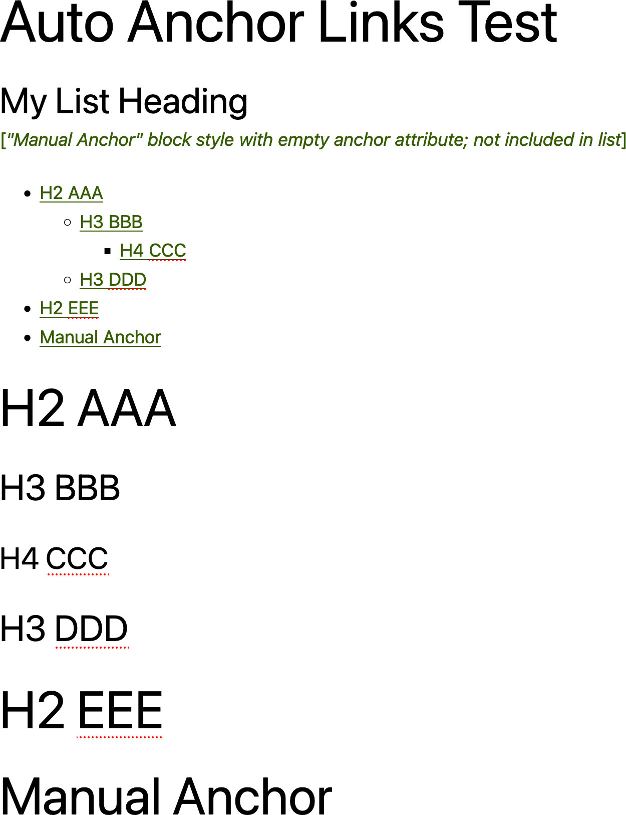Insert the „Auto Anchors Links List“ block where you’d like it to appear. A post can only contain one „Auto Anchor Links List“ block. Preview the post to view the list display and test links.