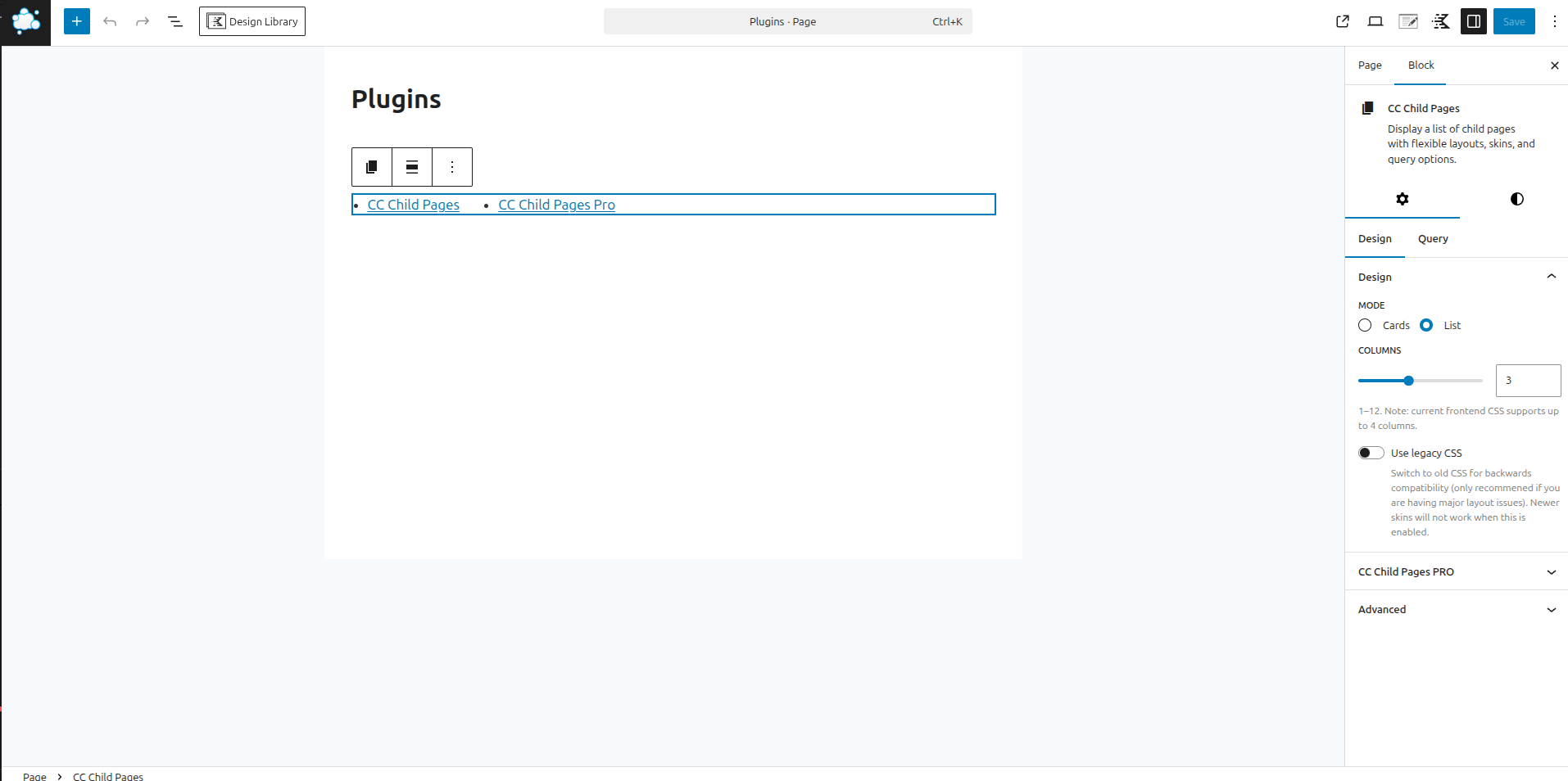 The CC Child Pages block provides a simple, visual interface for configuring these same options, complete with a live preview.