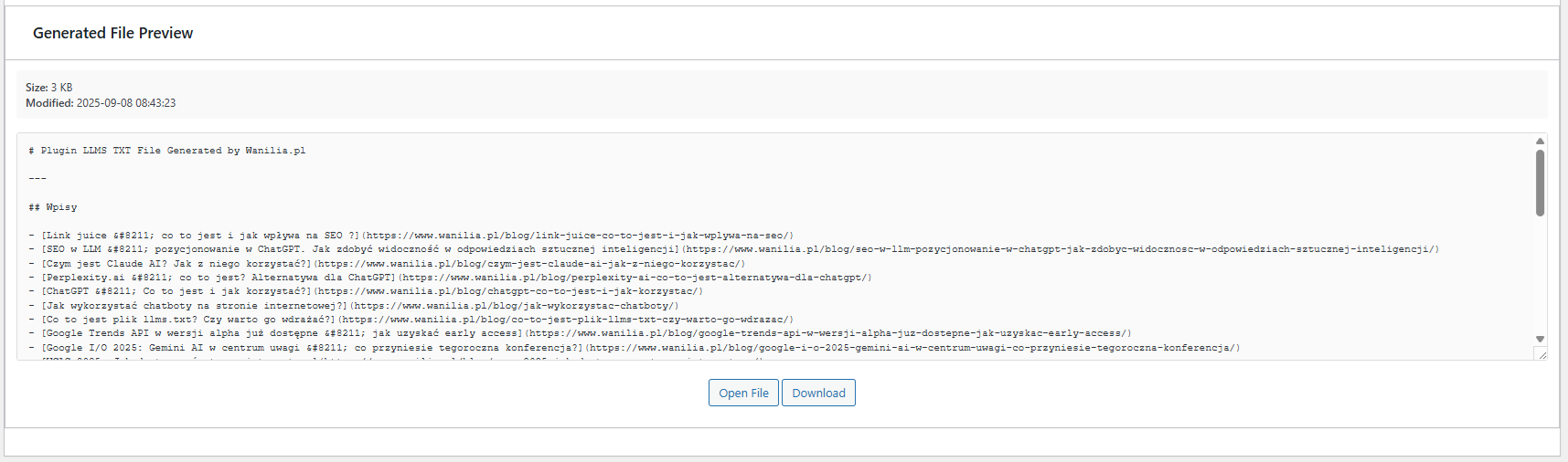 Generator LLMS TXT by Wanilia.pl is a WordPress plugin that automatically generates an llms.txt file containing a list of URLs from your WordPress site.