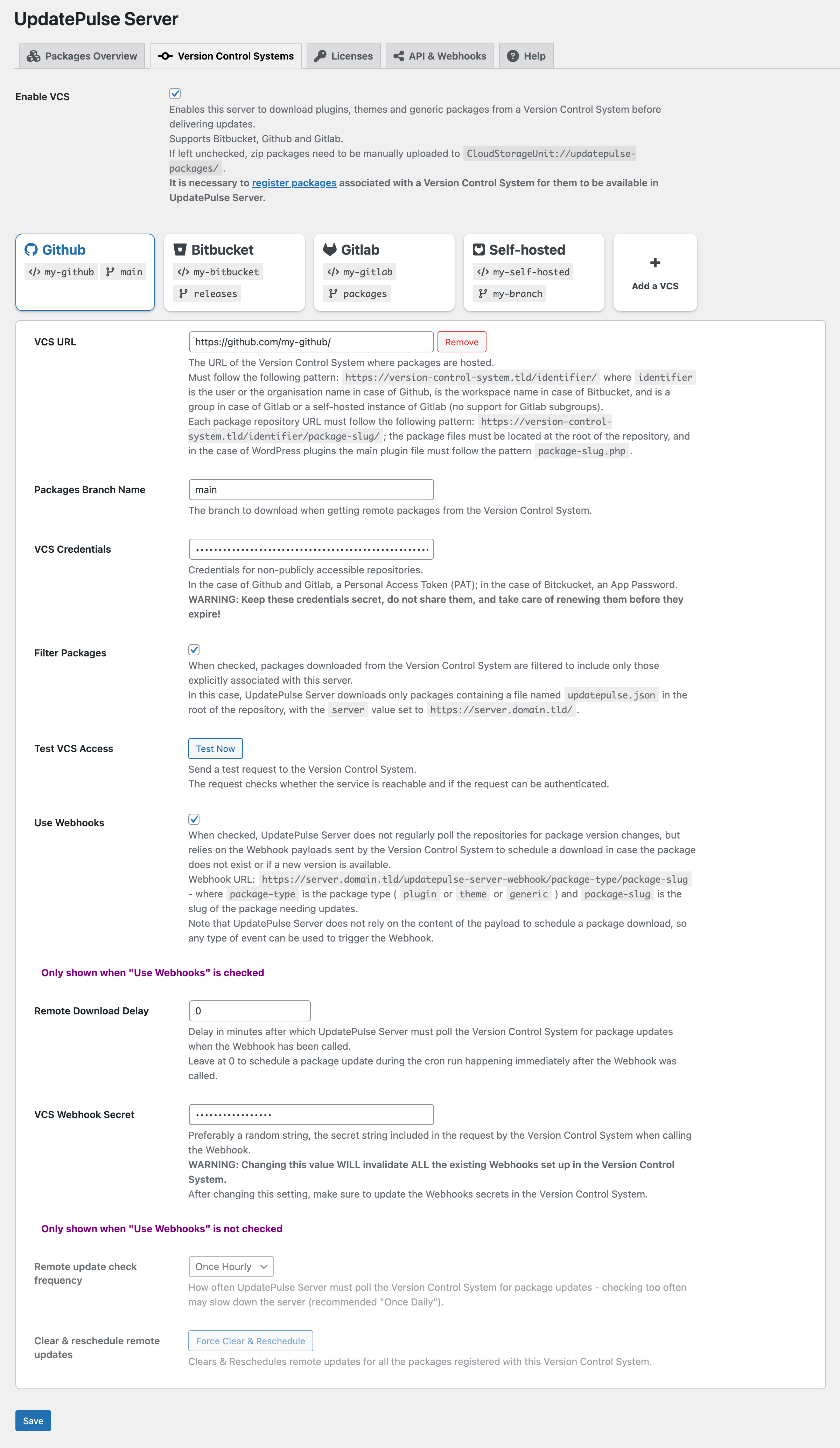 - Version Control Systems: Instead of manually uploading packages, use Version Control Systems to host packages, and download them to UpdatePulse Server automatically. Supports Bitbucket, Github and Gitlab, as well as self-hosted installations of Gitlab.