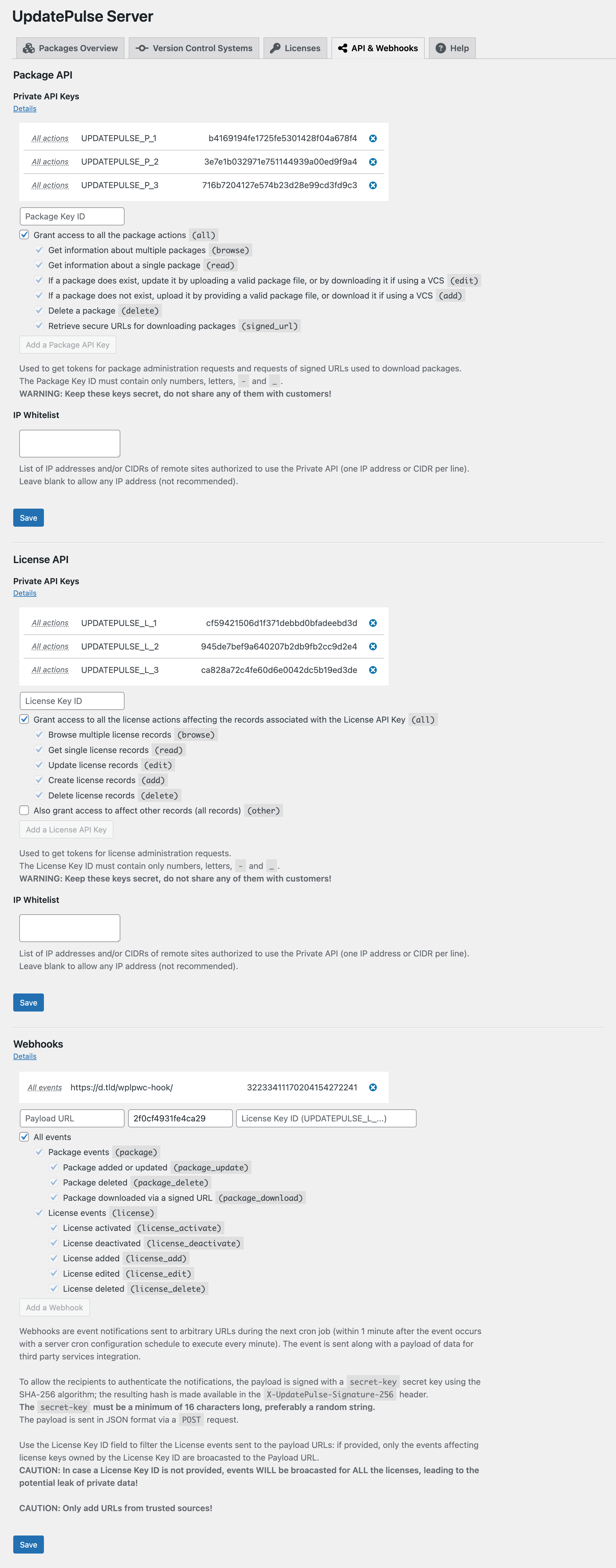 You can manage packages through the UpdatePulse Server interface, through the API, or by letting the plugin download them automatically from a Version Control System (preferred). The interface allows you to view a listing of packages, view details, delete, download, and upload new packages manually (discouraged).