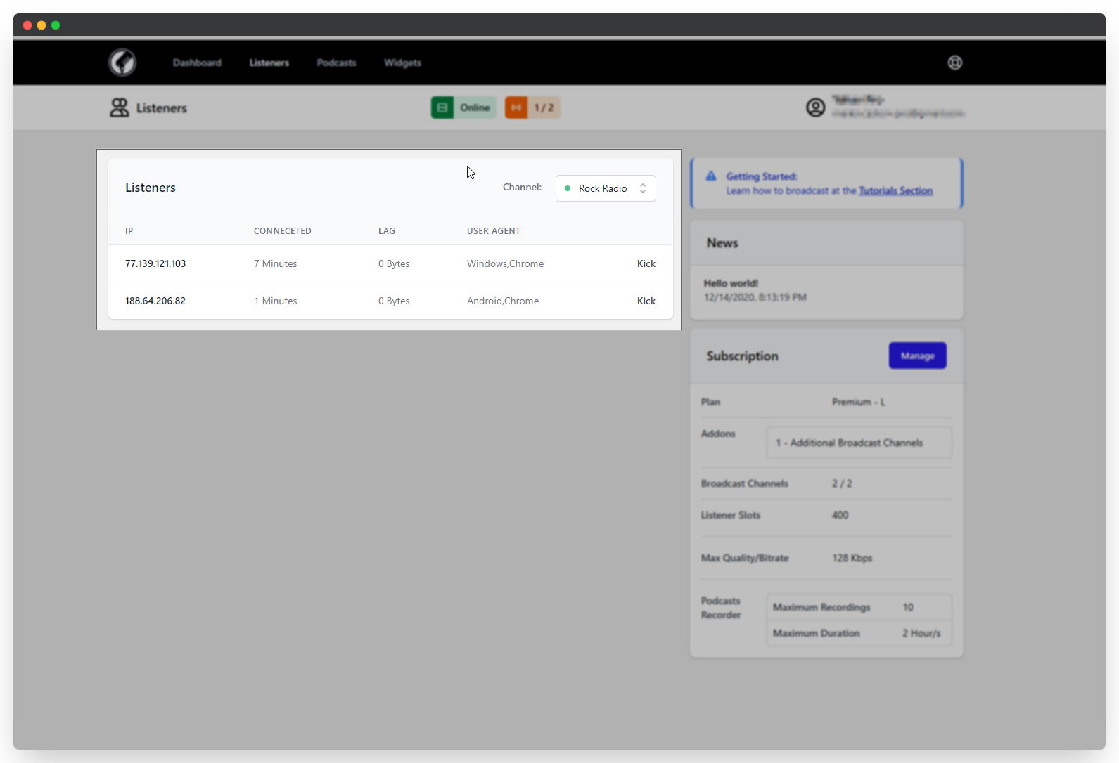 View your listeners information in real time, including connection duration, the device they are using to listen and the ability to drop specific listener.