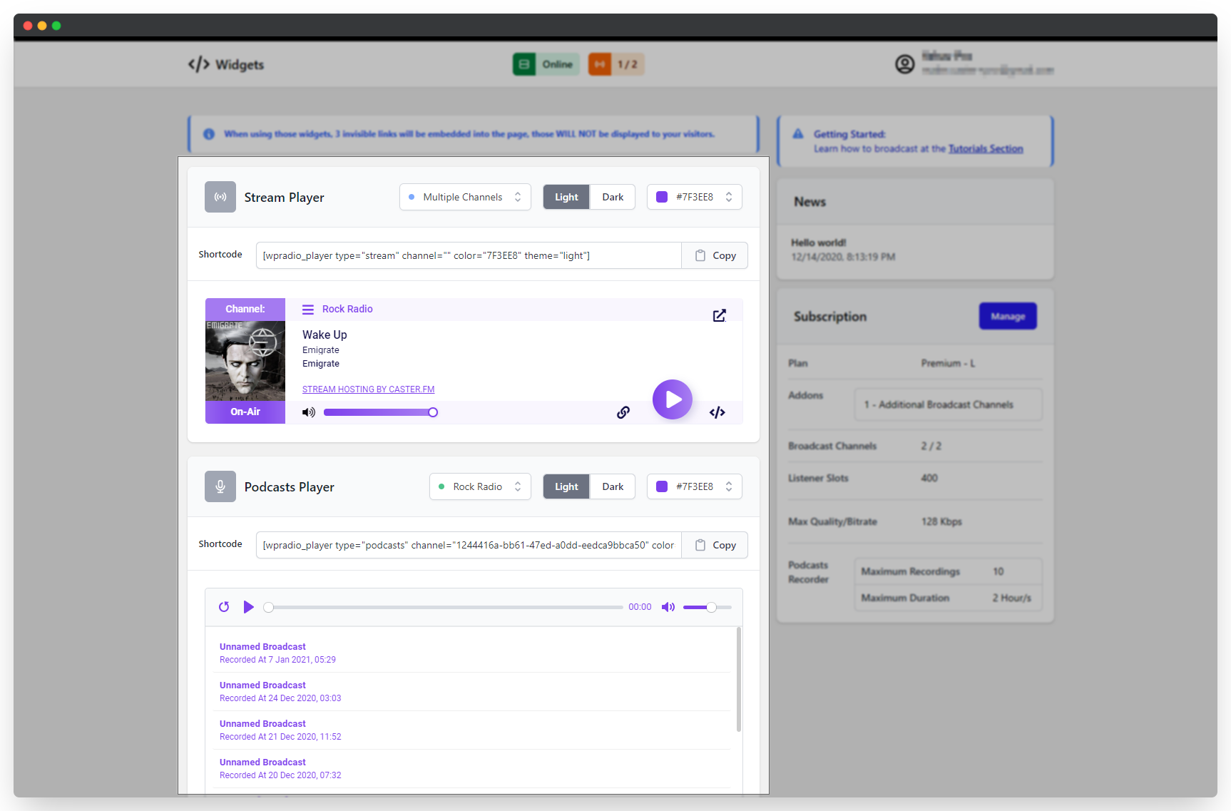 Customize the provided widgets / players and generate shortcodes for usage within your WordPress site.