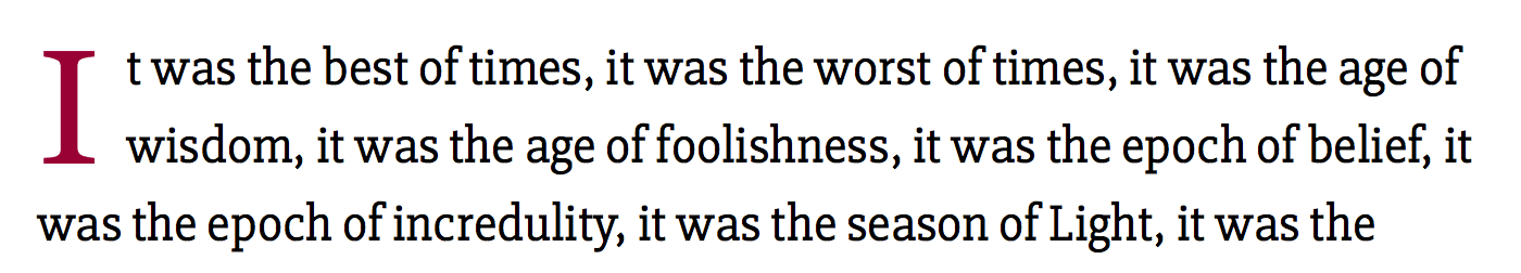 I use text indents at times for my paragraphs. The drop cap technique produces the odd quirk of applying the indent to the rest of the word using the drop cap. So that word doesn’t line up with the text line below. To escape that, I set the text indent: 0; for that paragraph. Depending on my structure, I may have to play with selectors a bit.