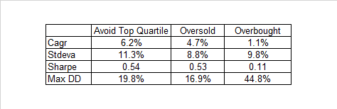 To represent the trend-following factor I used the data for the BarclayHedge SG Trend-Following Index which captures the profitability of CTAs that follow a systematic trend-following approach. For consistency, I used the same methodology as the original post: I took the 10-day return and smoothed using a 5-period simple moving average in order to reduce noise. I then took the percentile ranking using all history available at each point-in-time of that smoothed return. Oversold was considered to be when the percentile ranking of the return was below the median (<.5) and overbought was when the percentile ranking was above the median (>.5). Positions are held until the percentile ranking goes back above (below) the median. As a third strategy, I tested avoiding the top quartile of performance (<.75) which is a lower turnover and perhaps a more realistic strategy.
