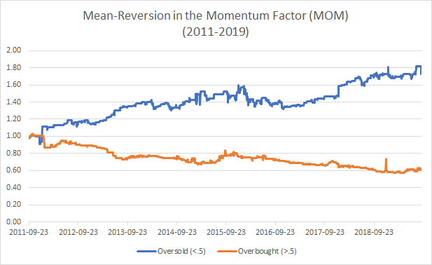 When the momentum factor was oversold (<.5) you made almost 17% annualized with a sharpe of 1.74, and in contrast when the momentum factor was overbought- which was nearly 50% of the time- you lost money. One of the obvious questions is whether there is some bias in the momentum methodology unique to MTUM that makes it less generalizable to a more concentrated approach. To address this concern I tested using the oscillator on QMOM or Alpha Architect’s U.S. Quantitative Momentum ETF. While there is a much shorter history the general conclusion is the same: mean-reversion in the momentum factor is a good way to time momentum stocks: