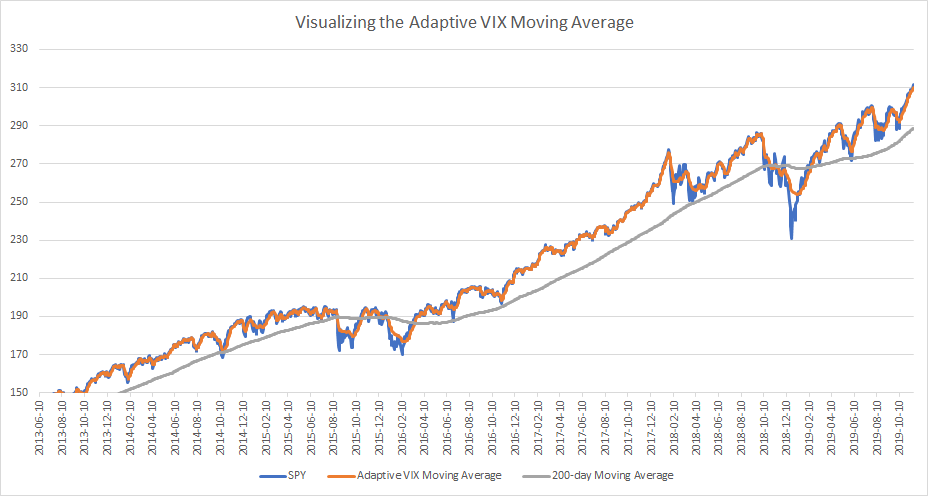 Another way to tackle this issue is to vary the lookback length as a function of the VIX. So how would we do that? Enter the basic adaptive moving average framework which seeks to vary the speed or lookback of the moving average as a function of some volatility or trend-strength function.