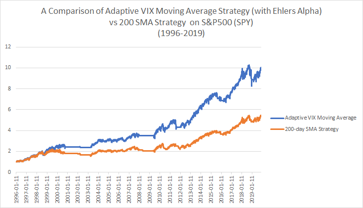 Consistent with the previous post the AMA strategy is superior to the basic 200sma strategy with fewer trades. The Ehlers alpha method in this case leads to very similar results as using the classic AMA framework for calculating alpha but with even fewer trades. Note that a “D” of 4 vs 4.6 produced a near identical match to the performance and number of trades as the classic AMA framework. In either case I hope this shows the robustness of using the VIX (or you could use historical volatility or GARCH) in an adaptive moving average as a substitute for using the price. In my opinion it is logical to use an adaptive method for smoothing rather than using static smoothing methods or worse yet the actual price in a trend-following strategy.