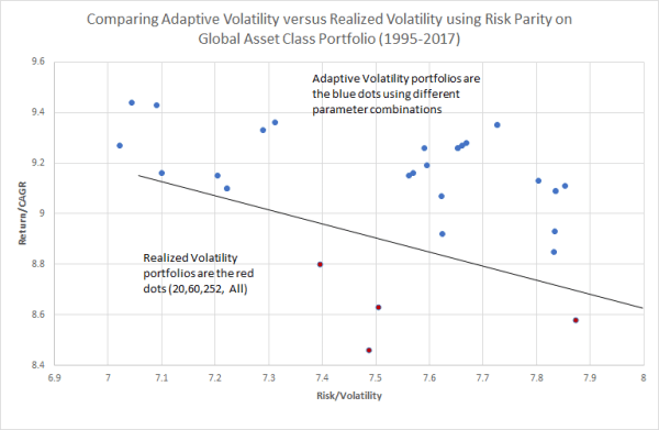 In order to test the robustness of the adaptive volatility measure we decided to follow the approach of forming risk parity portfolios which was inspired by this article by Newfound Research. Our simple Global Risk Parity portfolio uses five major asset classes: Domestic Equities (VTI), Commodities (DBC), International Equity (EFA), Bonds (IEF), and Real Estate (ICF). The choice of VTI was deliberate since we already did the first test using SPY. VTI contains the full spectrum of domestic equities including large, mid and small cap whereas SPY is strictly large cap. We created simple risk parity portfolios (position size is equivalent to 1/vol scaled to the sum of inverse vol across assets) with weekly rebalancing and a 1-day delay in execution. For realized volatility portfolios we ran each individually using various parameters including 20-day, 60-day, 252-day and all history. To test adaptive volatility we ran 27 different portfolios that varied the maximum smoothing constant and the r-squared lookback. The smoothing constant was varied between .1,.5 and .9 and the R-squared lookback was varied using 10,12,15,20,25,30,40,50 and 60 days. We chose to keep the multiplier (-10 in the original post) the same since it was a proxy for the longest possible lookback (all history) by design. The testing period was from 1995 to present and we used extensions with indices for the ETFs when necessary to go back in time. In the graph below we chart the return versus risk for each portfolio.