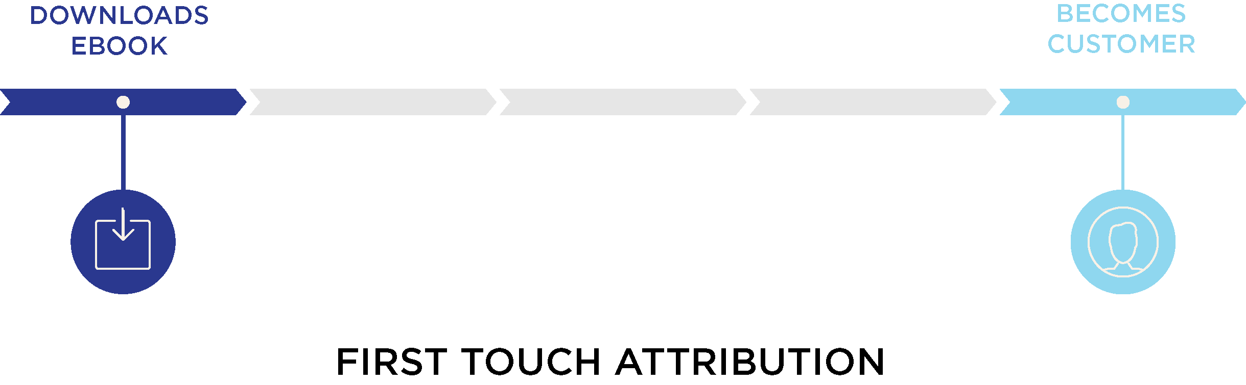 In first touch attribution, all credit for a lead is given to the “first touch” taken by a lead. For example, if a lead is initially generated by filling out a form to download an eBook, that eBook gets complete credit for the sale.