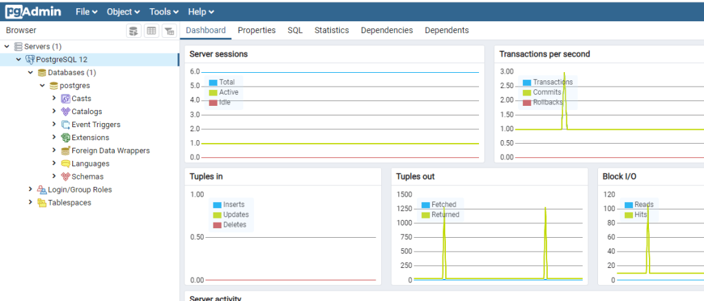 After this the engine will install. It would be good to reboot once the install is complete. Then, type pgadmin and the prompt will appear for you to enter the SA password created above. Once that is entered, you should see a screen with the master ‘postgres’ database as below. In the next post we can step through server settings and creating a database.