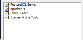 The first option is the database engine. The second, pgadmin 4, is the PostGresQL equivalent of SSMS. We can use Azure Data Studio as well but would be good to have this too to make a comparison if needed. Stack Builder is an install utility that helps with add-ons to PostGreSQL. Command Line Tools can come in very useful for many commands. So in short, it is good to have all these installed.