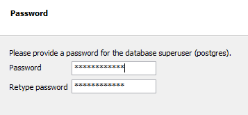 The second option asks for a password for SA equivalent of PostGreSQL. Be sure to record this in the password vault as there is no secondary mechanism to recover if it is lost.