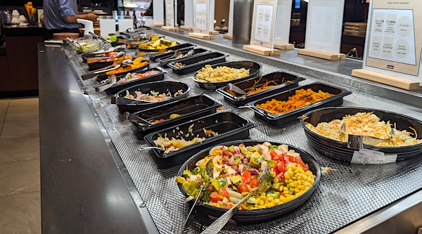 レタスやキュウリ、ミニトマトなど単独のサラダボウルのエリアと、コブサラダなど和えてるサラダボウルのエリアから分かれていました。