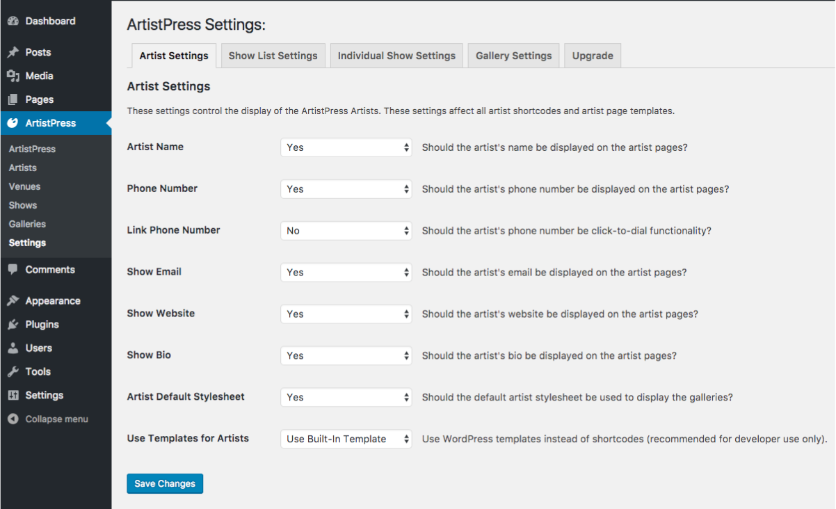 - Click on the “Settings” sub menu under “ArtistPress” to adjust settings.