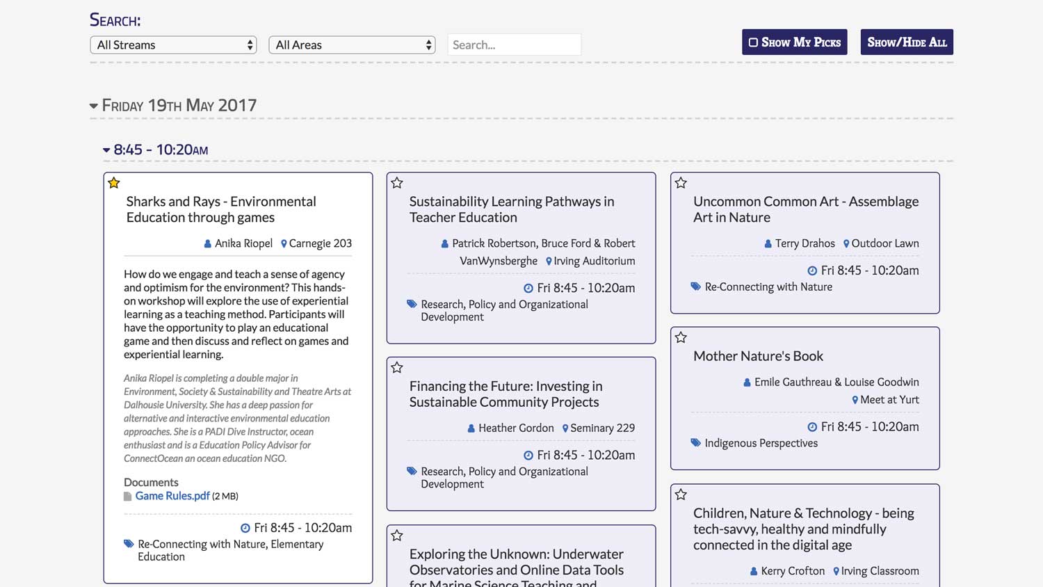 - Collects and displays important information about each workshop: workshop code, time, location, description, presenter, presenter bio, participant limit