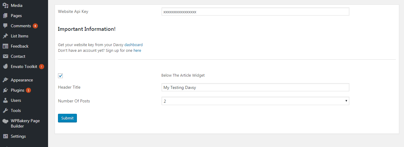3- Login to WordPress Admin >> Go to Davsy Settings >> Put Activation Key, No. of Posts and Widget Title >> Click Save