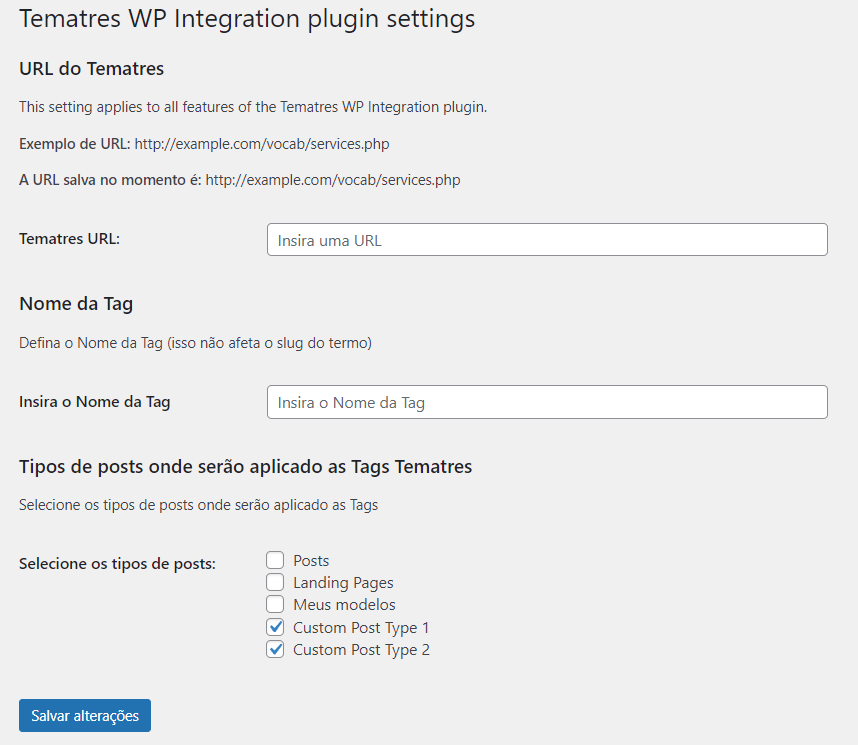 Install and activate the plugin. Go to the “Tematres WP Integration” menu in the panel and configure the requirements: